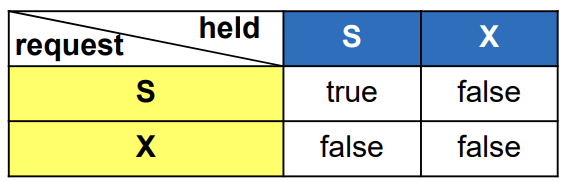 - (ex) A에 T1이 shared lock 걸은 상태에서 T2가 exclusive lock 요청 → incompatible → T1이 lock 해제할 때까지 T2는 기다려야 함